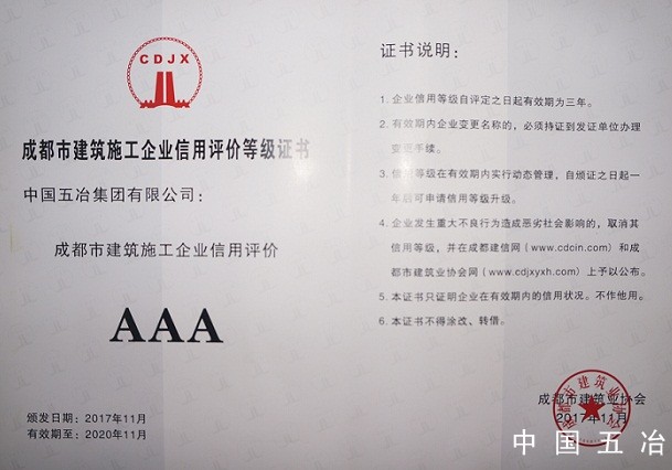 成都市建筑施工企業信用評價AAA等級證書