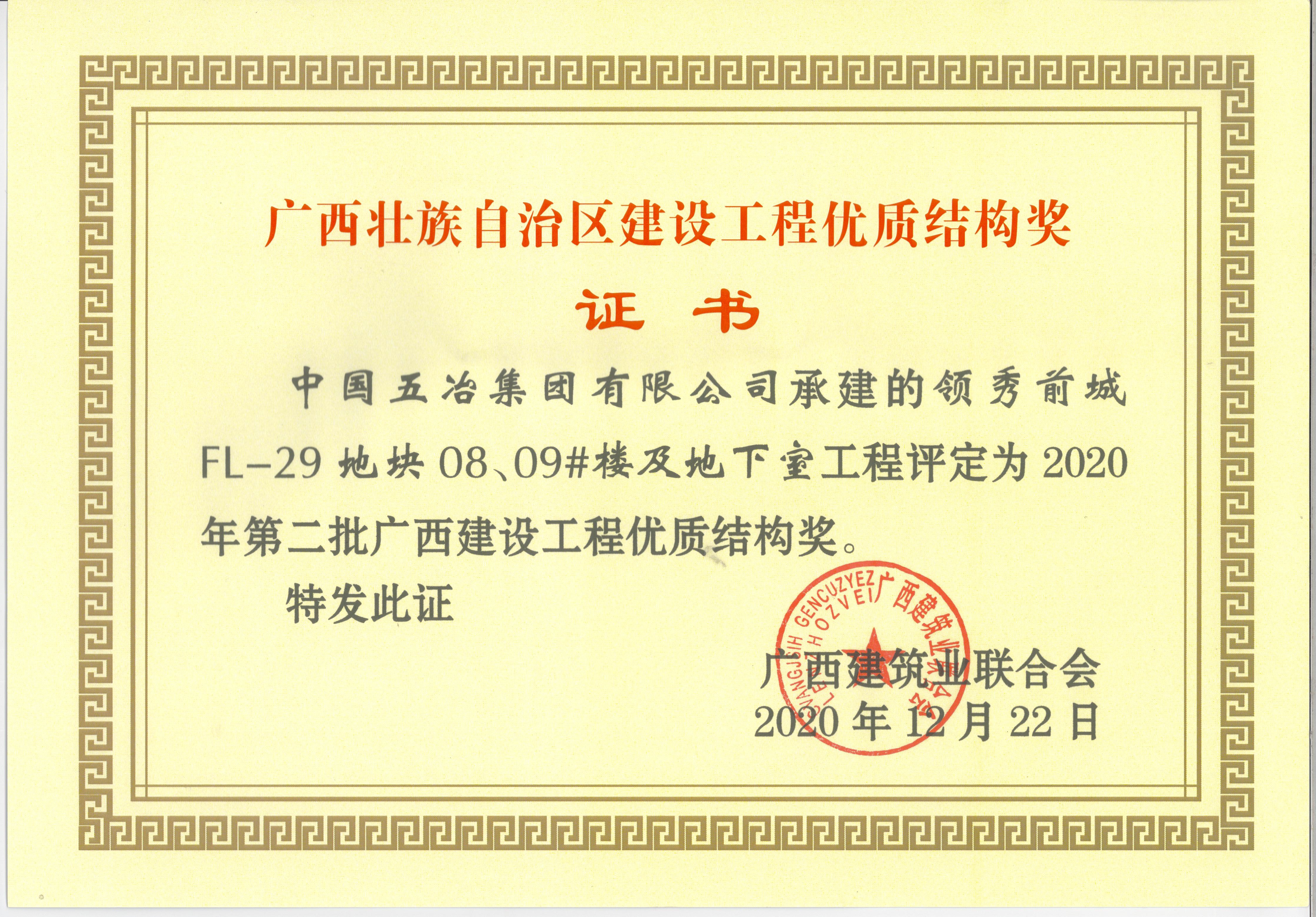 領秀前城FL-29地塊08、09#樓及地下室工程—2020年第二批廣西建設工程優質結構獎