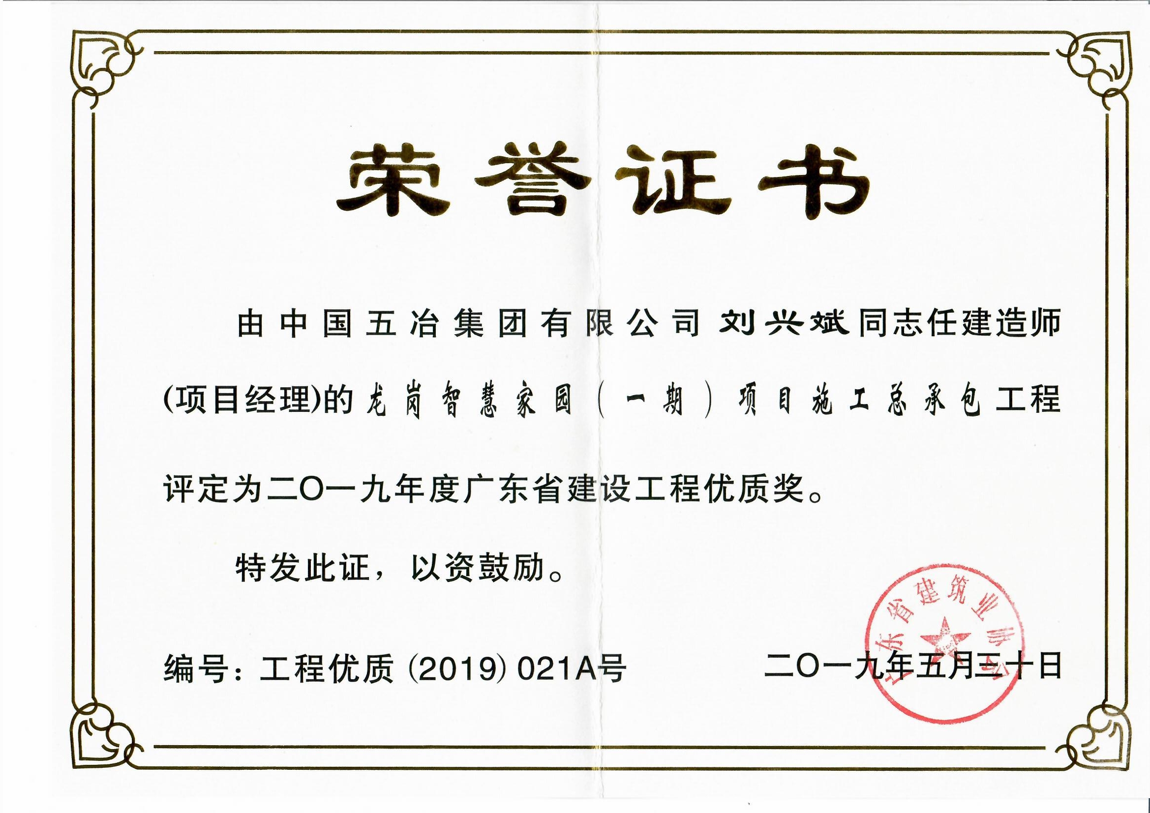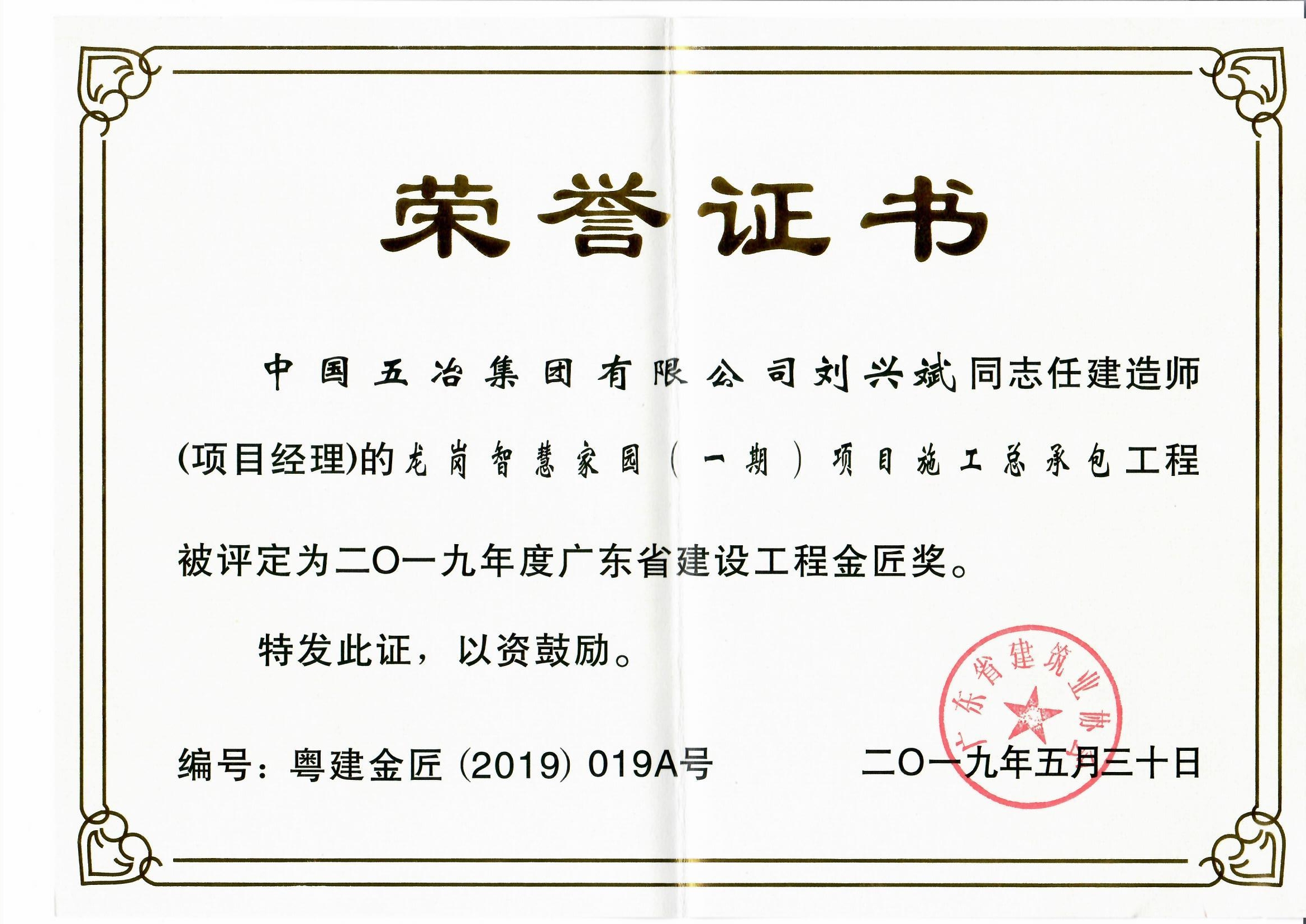 龍崗智慧家園(一期)項目施工總承包工程被評定為二〇一九年度廣東省建設工程金匠獎