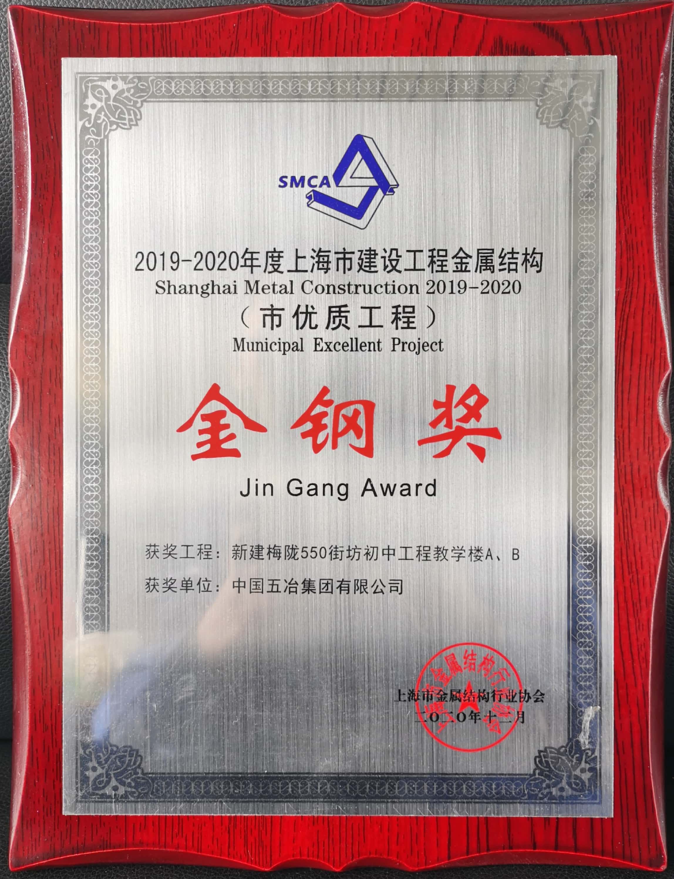 新建梅隴550街坊初中工程教學樓A、B榮獲2019-2020年度第二批上海市建設工程金屬結構“金鋼獎”(市優質工程)