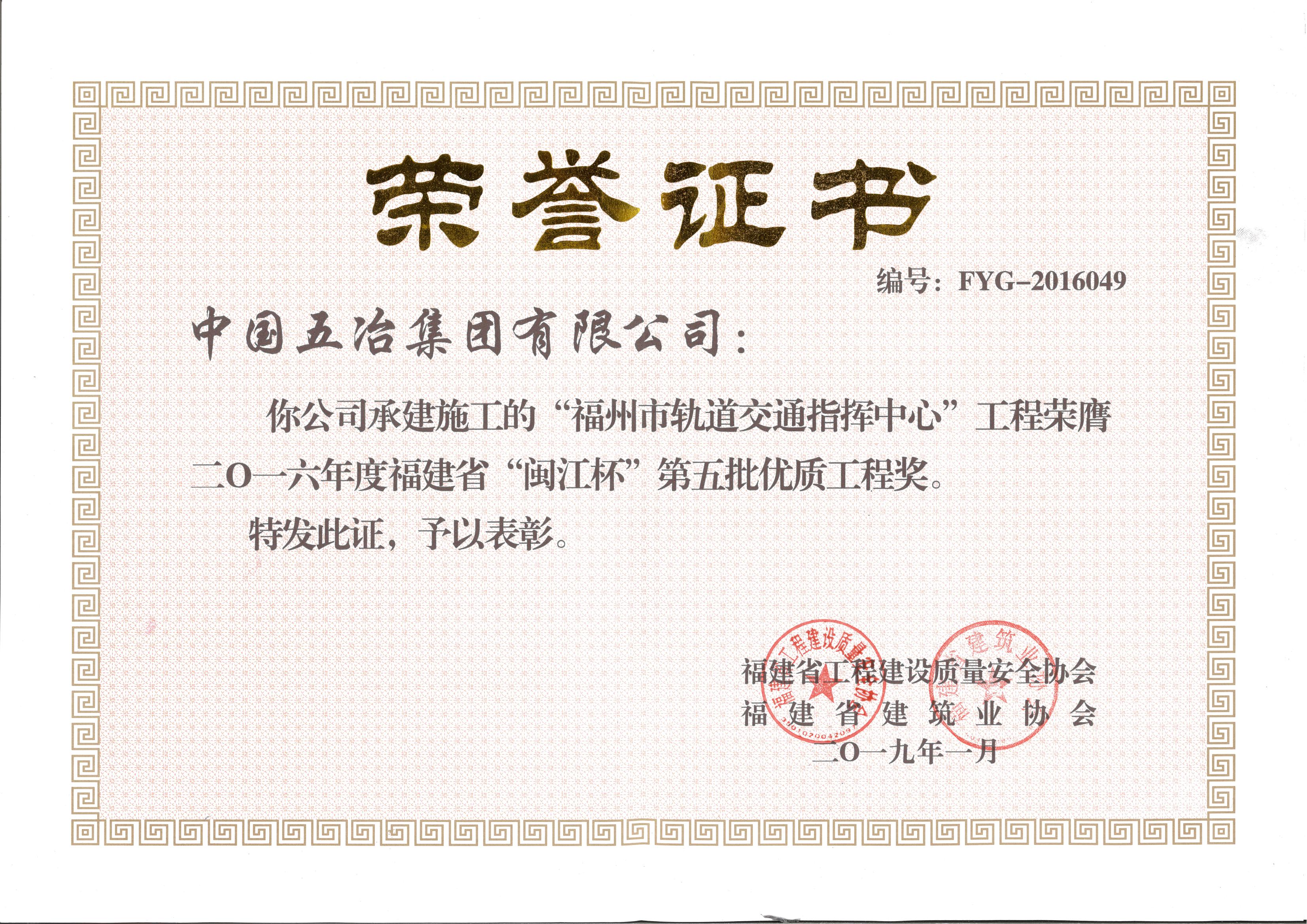 福州市軌道交通指揮中心工程榮膺二0一六年度福建省“閩江杯”第五批優質工程獎