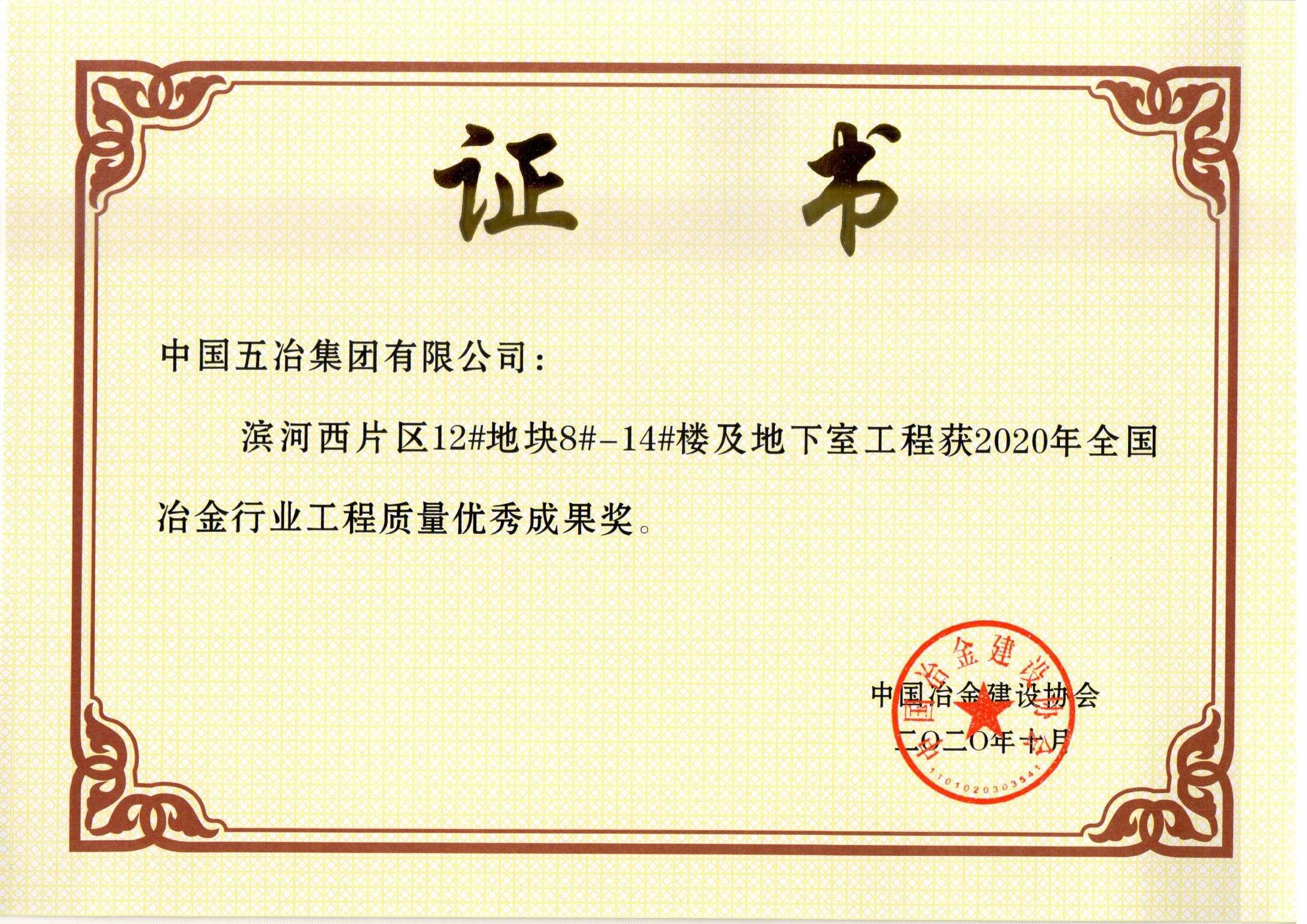 濱河西片區12#地塊8#-14#樓及地下室工程獲2020年全國冶金行業工程質量優秀成果獎