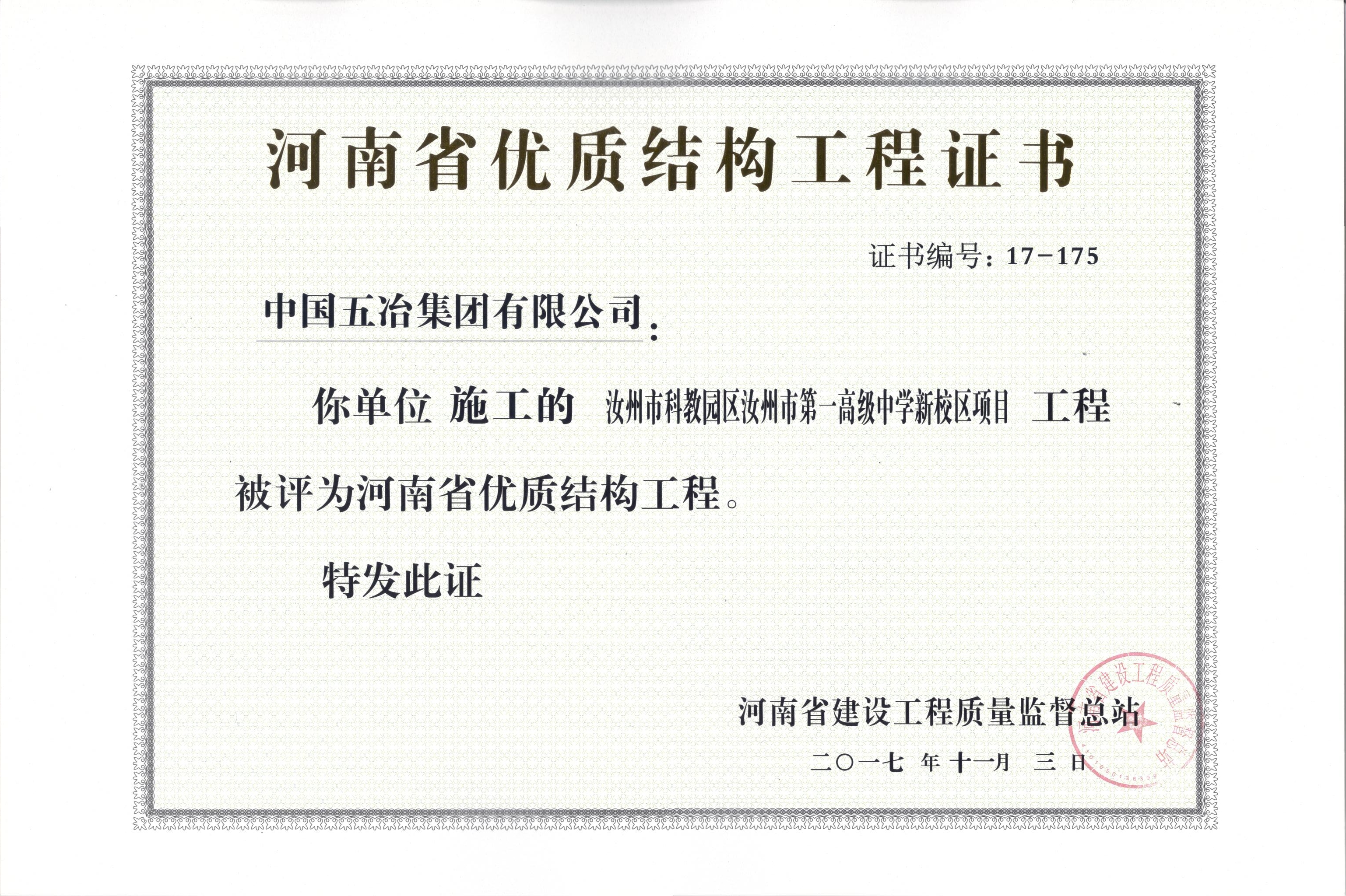 汝州市科教園區(qū)汝州市第一高級中學(xué)新校區(qū)項目工程榮獲2017年河南省優(yōu)質(zhì)結(jié)構(gòu)工程獎