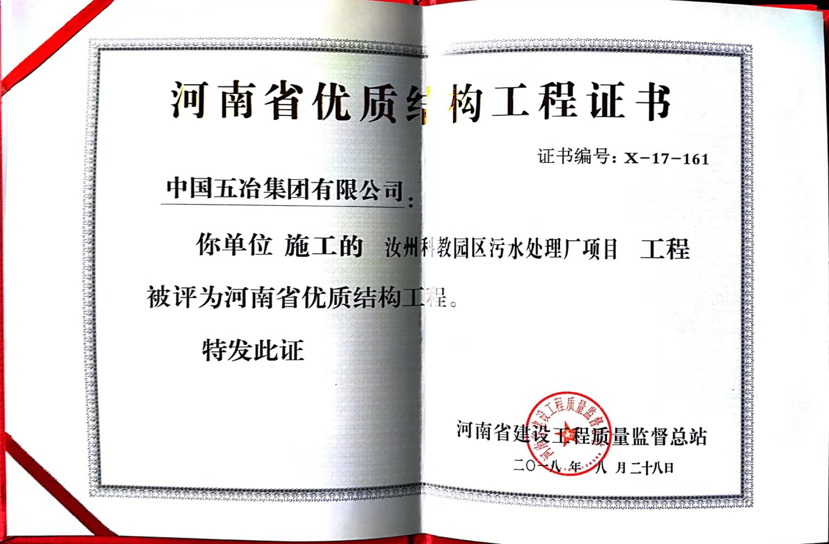 汝州科教園污水處理廠工程榮獲2017年下半年度河南省優(yōu)質(zhì)結(jié)構(gòu)工程獎