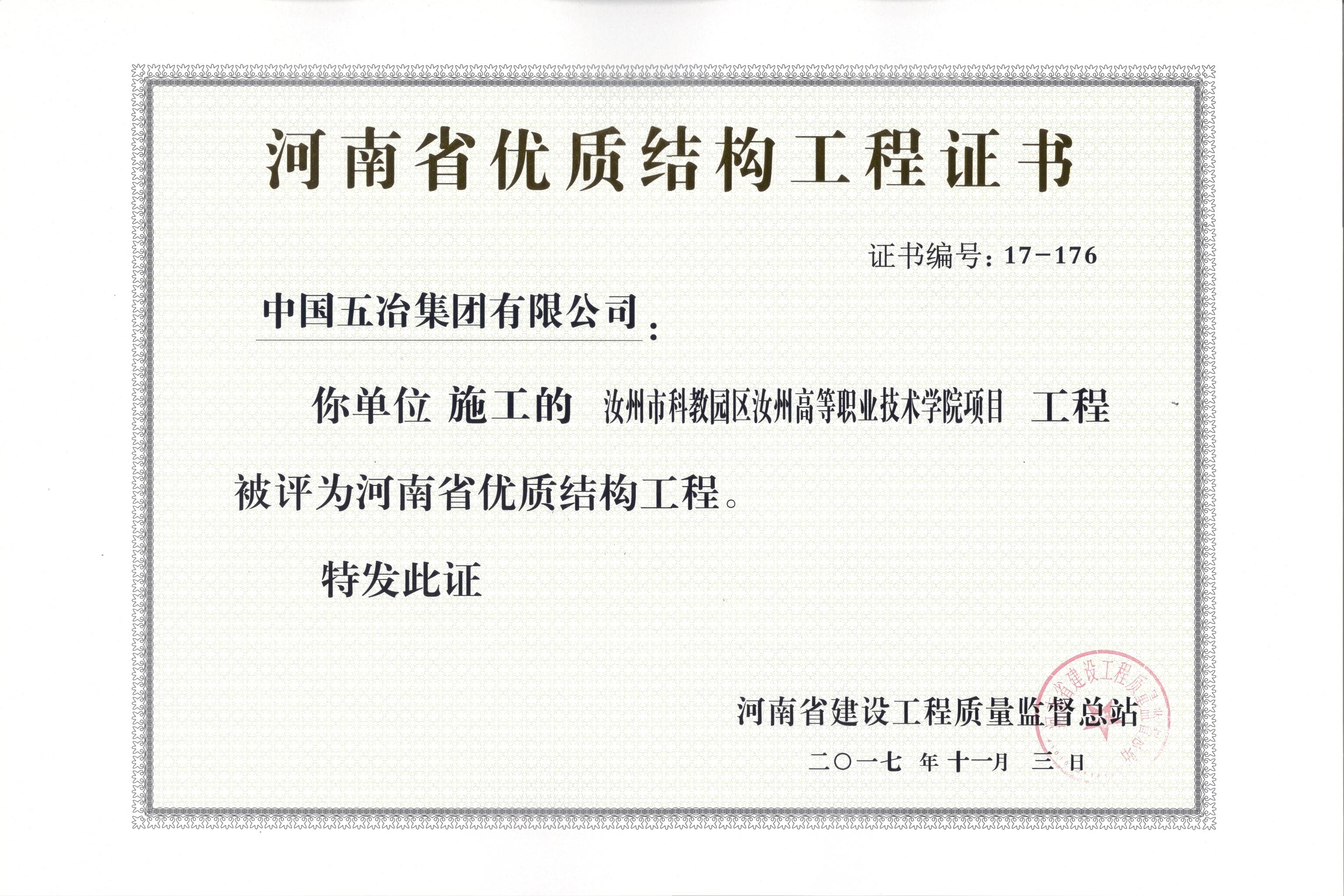 汝州市科教園區(qū)汝州高等職業(yè)技術(shù)學(xué)院項目獲2017年河南省優(yōu)質(zhì)結(jié)構(gòu)工程獎