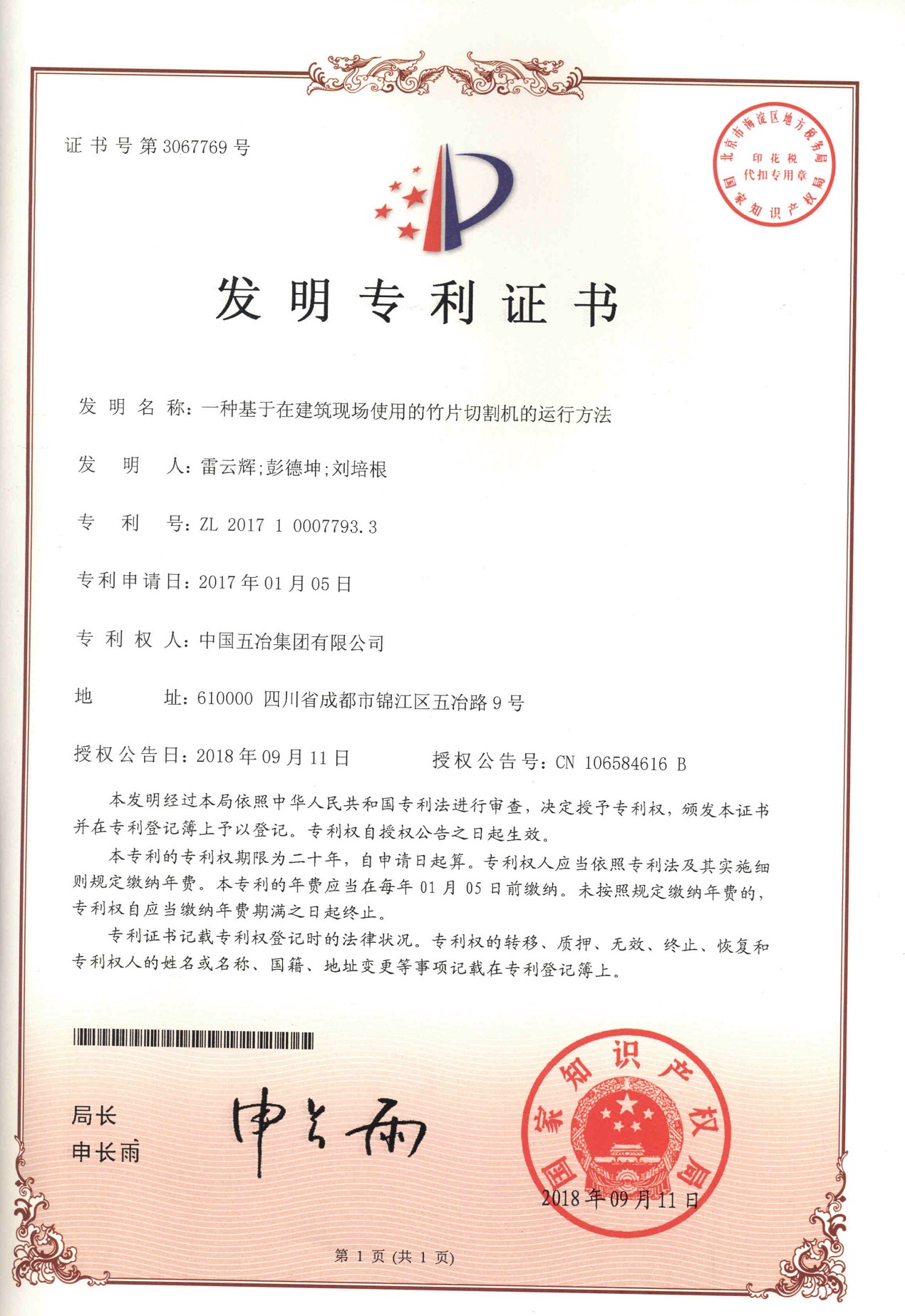 一種基于在建筑現場使用的竹片切割機的運行方法 ZL 201710007793.3