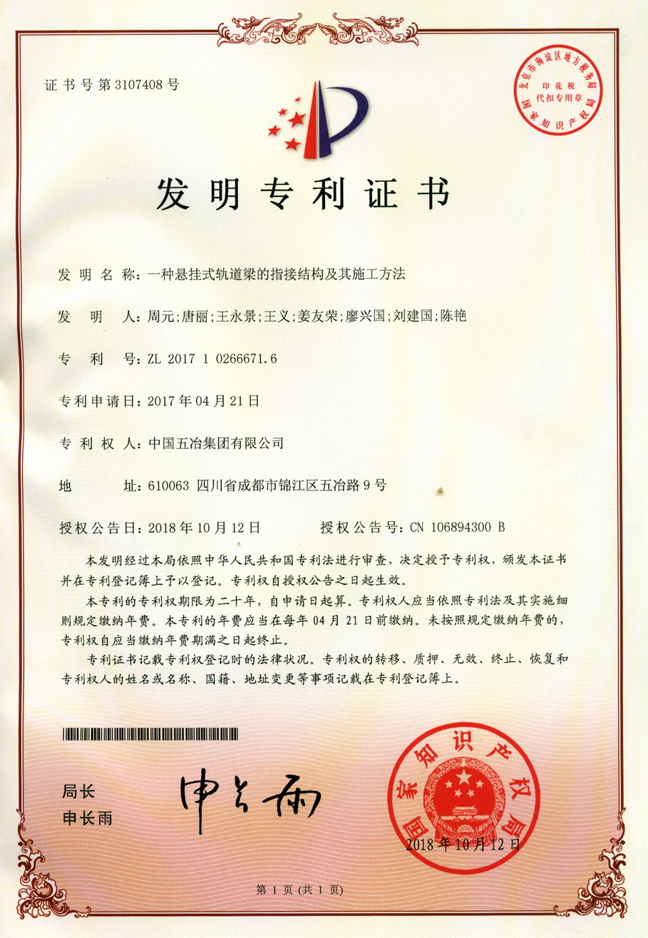 一種懸掛式軌道梁的指接結構及其施工方法 ZL 201710266671.6