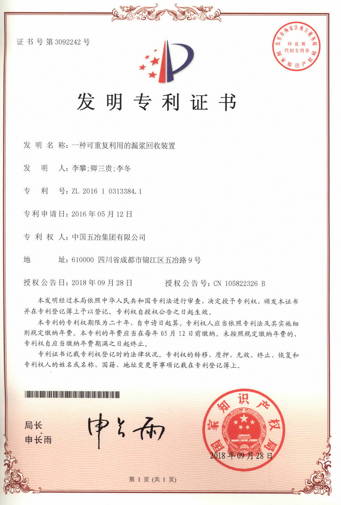 一種可重復利用的漏漿回收裝置 ZL 201610313384.1