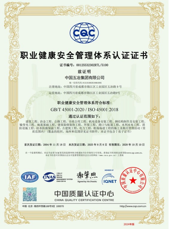 中國五冶集團有限公司(以下簡稱中國五冶集團),1997年通過ISO9000質(zhì)量體系認證。2004年,中國五冶集團按照ISO9001、ISO14001、OHSAS18001國際標準要求,建立質(zhì)量環(huán)境職業(yè)健康安全整合型管理體系并通過三標一體認證。2011年,中國五冶集團按照GB/T50430-2007《工程建設(shè)施工企業(yè)質(zhì)量管理規(guī)范》要求,建立并通過質(zhì)量環(huán)境職業(yè)健康質(zhì)量管理規(guī)范的三標一規(guī)范體系認證,至今保持三標一規(guī)范管理體系連續(xù)、平穩(wěn)和協(xié)調(diào)運行。