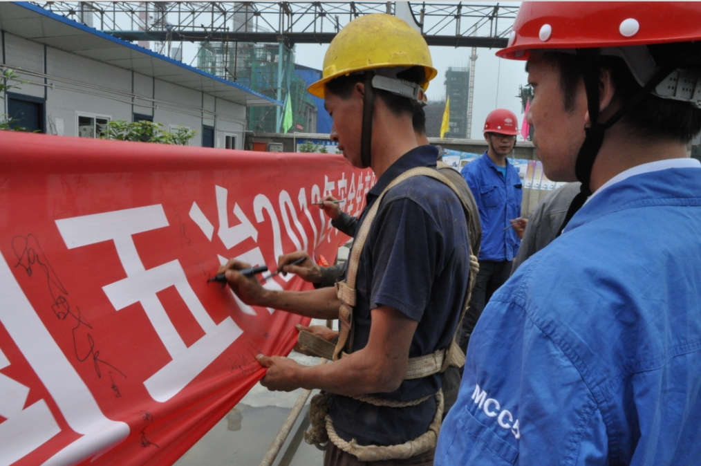 為了認真貫徹全國第十二個安全生產月和全總第十四屆“安康杯”競賽活動精神,營造安全氛圍,唱響“科學發展、安全發展”主旋律,公司2012年安全生產月活動、安康杯暨青安杯活動66日在威鋼施工現場拉開了序幕。經過前期策劃,制定了2012年安全生產月和“安康杯”、“青安杯”活動方案,并陸續在全公司范圍內開展。66日下午530分,威鋼焦化項目現場熱鬧非凡,200余名農民工和爐窯分公司、一分公司以及機電分公司項目管理人員一起鄭重宣誓:“保證安全生產是我們崇高的職責,為了企業整體利益,為了個人生命安全,為了家庭幸福安康,我承諾一定要恪盡職守,遵守紀律,規范作業,文明施工,確保安全!”整齊洪亮的宣誓聲在繁忙的工地上空響起,這也標志著“中國五冶集團2012年安全生產月活動、安康杯暨青安杯活動”正式啟動。
