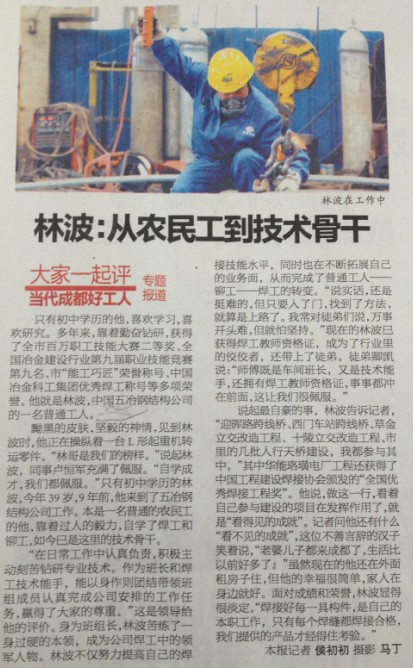 4月15日,成都市總工會聯合成都電視臺、成都廣播電臺、成都日報、成都商報等成都市多家新聞媒體對當代成都好工人候選人——鋼構分公司三車間班長、焊工林波進行了采訪,錄制了“走基層——尋訪當代成都好工人”節目,并在成都電視臺新聞綜合頻道(CDTV—1)《新聞18點》欄目中進行宣傳報道。成都商報、成都日報等媒體進行了專題報道。