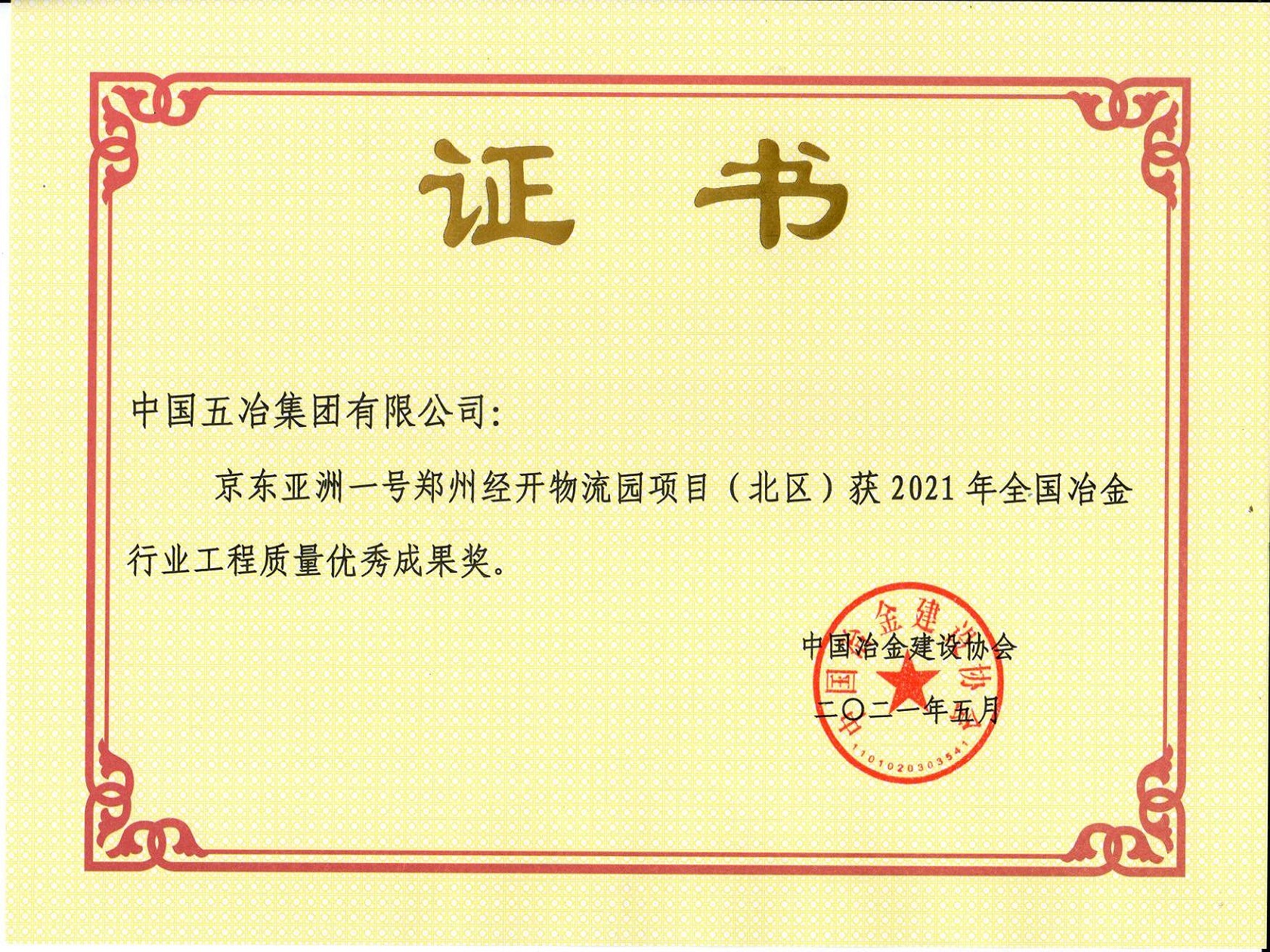 京東亞洲一號鄭州經開物流園項目(北區)榮獲2021年全國冶金行業工程質量優秀成果獎