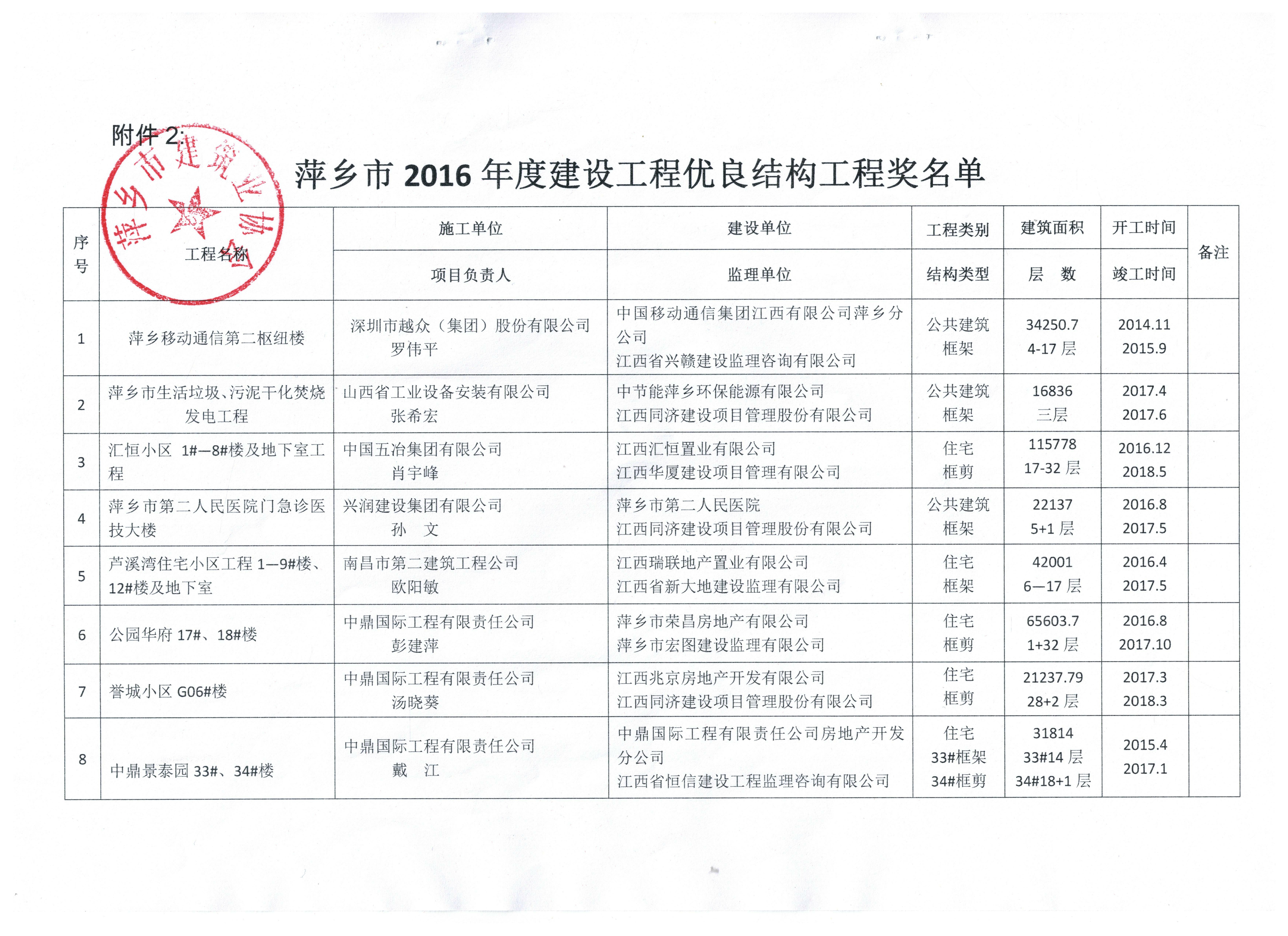 匯恒小區1#-8#樓及地下室工程榮獲2016年度萍鄉市建設工程優良結構工程獎