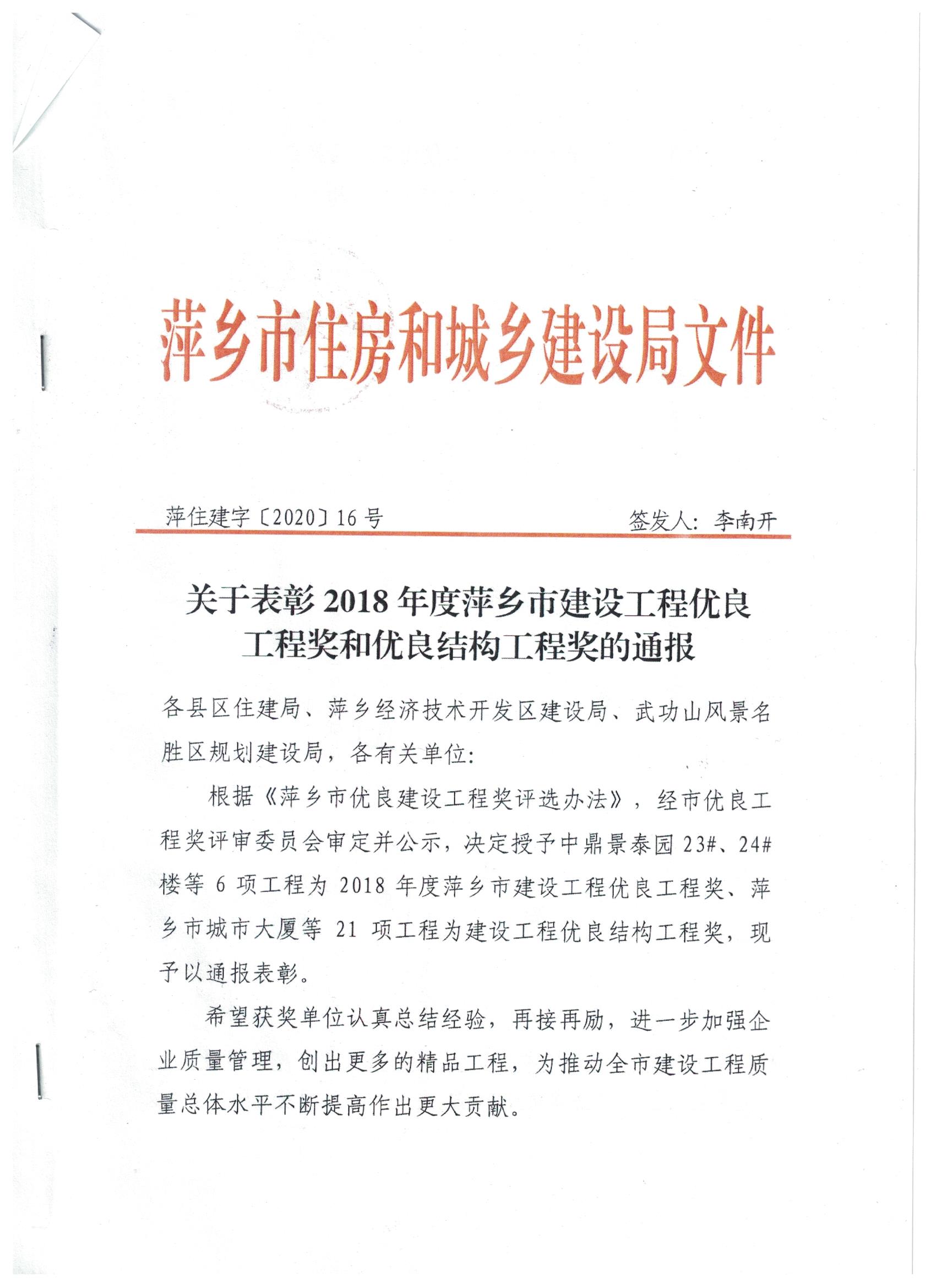 上栗縣城鎮化基礎設施建設PPP項目縣北工業園標準化廠房工程榮獲2018年度萍鄉市建設工程優良結構工程獎