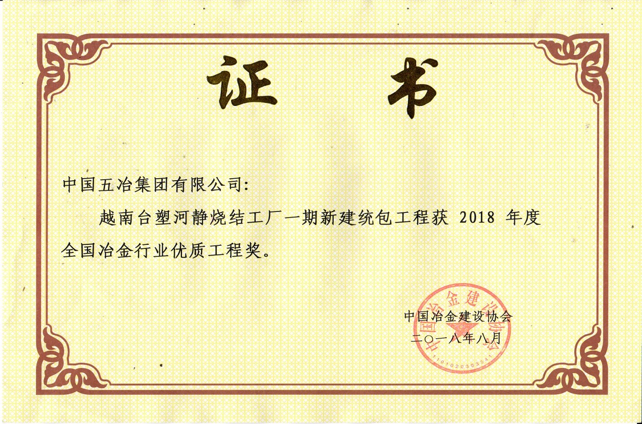 越南臺塑河靜燒結工廠一期新建統包工程——2018年全國冶金行業優質工程獎