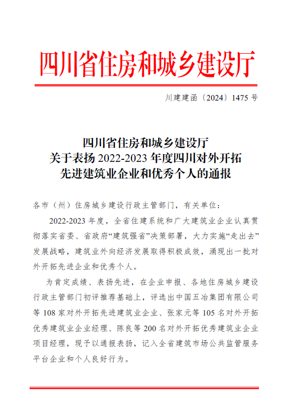 近日,四川省住房和城鄉(xiāng)建設(shè)廳印發(fā)《關(guān)于表揚2022-2023 年度四川對外開拓先進建筑業(yè)企業(yè)和優(yōu)秀個人的通報》,中國五冶集團榮獲多項表彰。