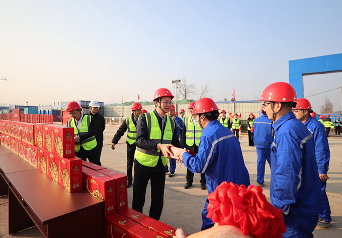 2月21日正月初五,中國五冶集團黨委書記、董事長朱永繁,黨委副書記、總經理張剛一行前往成都市西河污水處理三廠建設項目和中國五冶集團(成都)建筑科技產業園,看望慰問堅守在生產一線的員工,為他們送去新春祝福和豬肉、牛奶、面包、方便面、水果、堅果零食等節日慰問品,并開展帶班檢查。