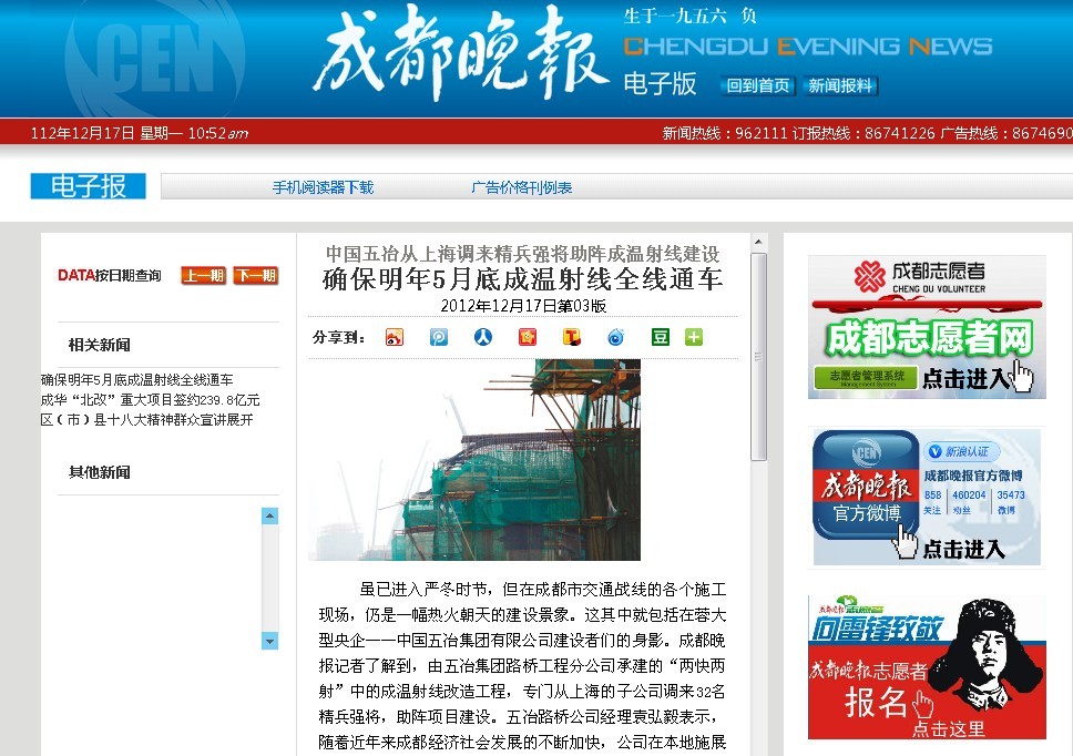 雖已進(jìn)入嚴(yán)冬時(shí)節(jié),但在成都市交通戰(zhàn)線的各個(gè)施工現(xiàn)場(chǎng),仍是一幅熱火朝天的建設(shè)景象。這其中就包括在 蓉大型央企——中國(guó)五冶集團(tuán)有限公司建設(shè)者們的身影。成都晚報(bào)記者了解到,由五冶集團(tuán)路橋工程分公司承建的“兩快兩射”中的成溫射線改造工程,專(zhuān)門(mén)從上海 的子公司調(diào)來(lái)32名精兵強(qiáng)將,助陣項(xiàng)目建設(shè)。五冶路橋公司經(jīng)理袁弘毅表示,隨著近年來(lái)成都經(jīng)濟(jì)社會(huì)發(fā)展的不斷加快,公司在本地施展拳腳的空間也越來(lái)越大, “我們有信心,為家鄉(xiāng)的建設(shè)不斷添磚加瓦。”