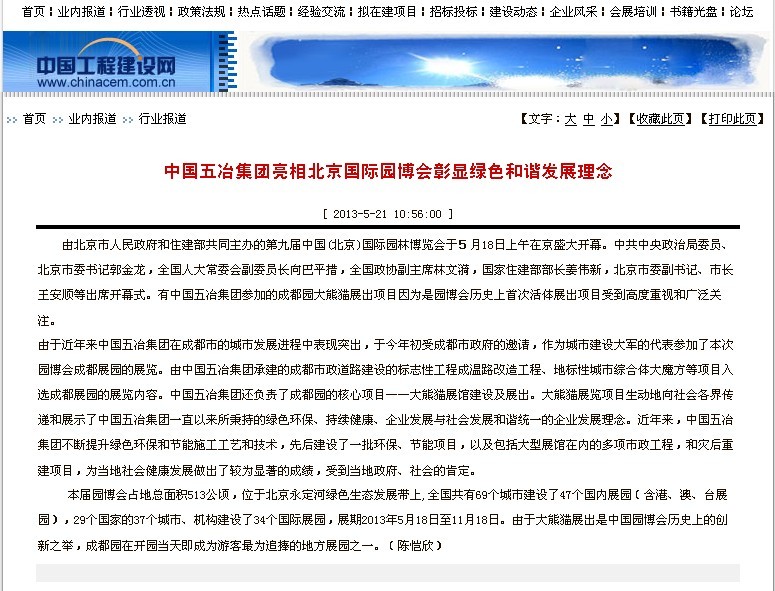 中國工程建設(shè)網(wǎng)報道:中國五冶集團亮相北京國際園博會彰顯綠色和諧發(fā)展理念