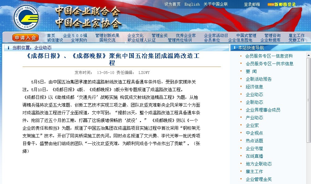 中國企業聯合會網報道:《成都日報》、《成都晚報》聚焦中國五冶集團成溫路改...
