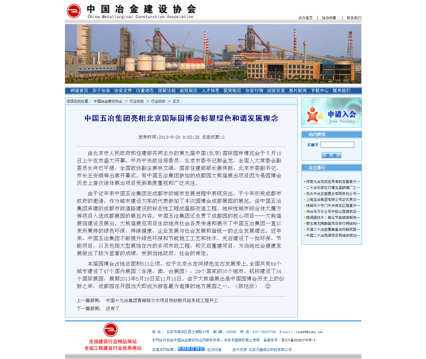中國冶金建設網報道:中國五冶集團亮相北京國際園博會彰顯綠色和諧發展理念