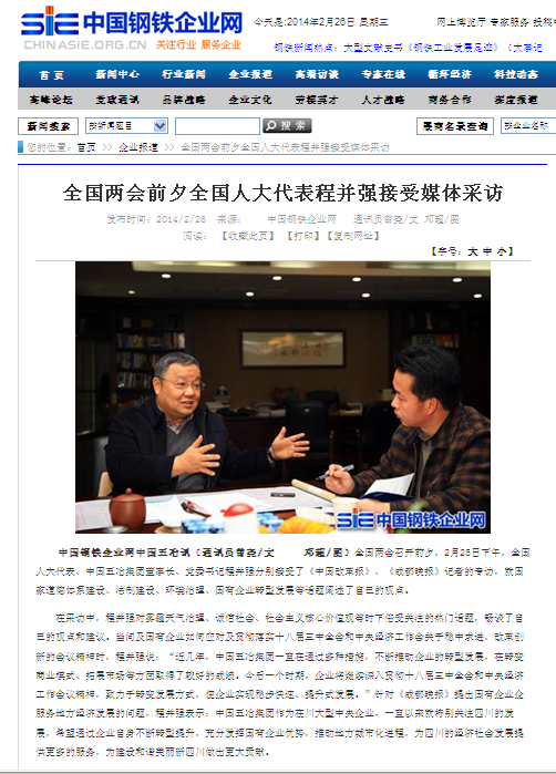 中國鋼鐵企業網報道:全國兩會前夕全國人大代表程并強接受媒體采訪