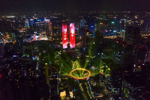 從高空俯瞰,內直徑達90米、外直徑達110米的“交子之環”景觀橋,如同紅色巨環般耀眼奪目,與高達218米的天府國際金融中心雙塔東西相望,一齊閃耀在成都金融城的璀璨夜色中。