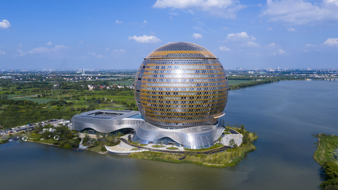 湖州太陽酒店項目位于浙江湖州南潯區(qū),是主體直徑97.2米的世界最大球體建筑,也是集住宿、餐飲、娛樂、旅游等多功能于一體的五星級綜合性酒店。項目通過深度應用建筑信息技術,建立了覆蓋各個專業(yè)和建設全周期的“全科醫(yī)生檔案”,不僅為施工質量及安全保駕護航,同時,針對球體鋼結構、單層穹頂網殼提升、弧形管道深化及預制等方面難題重點突破,讓太陽得以驚艷“閃耀”,成為湖州的城市地標和熱門網紅打卡點。