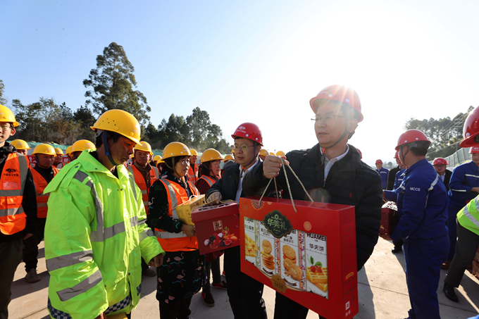 朱永繁董事長一行先后來到兩項目現場,詳細了解項目概況、工期進度、策劃編制及執行、履約管理、春節加班安排等方面情況,并向他們送去豬肉、糕點、水果等節日慰問品。在隨后召開的座談會上,朱永繁董事長代表集團公司向新春佳節期間堅守崗位的廣大員工、合作伙伴及各位工友表示敬意和感謝,祝大家新年快樂,幸福安康。他指出,2024年是公司“十四五”規劃極為關鍵的一年,五冶集團面臨的形勢更加嚴峻,挑戰更高,壓力更大,全體五冶人特別是各級領導務必拿出拼的精神、干的狀態,做到“放假不放松,休息不休戰”,一如既往抓好安全生產、現場管理、市場拓展等工作,堅決扛起責任擔當,拼搏沖刺奮斗,推動集團公司實現里程碑式的新跨越。