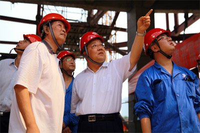 下午三時許,室外溫度超過35°,在成都大魔方項目部,程并強一行和項目部一線員工親切交談,感謝他們冒著高溫不辭辛苦地工作。在觀看大魔方項目動畫演示介紹后,程并強來到演藝中心施工現場,仔細了解工程進度情況和存在的難點問題,他要求項目部嚴格按照公司管理做好工作,相互協調溝通,做好總包的經驗總結。