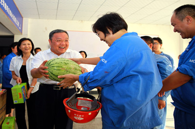 ???????????????????? ?程并強在元華路為一線員工送上西瓜