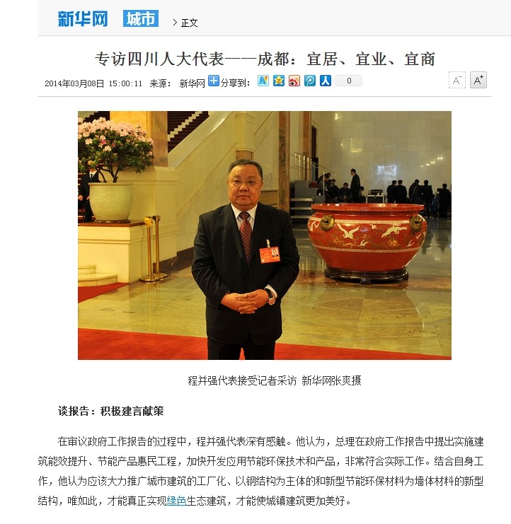 全國人大代表、中國五冶集團董事長、黨委書記程并強結合總理作的政府工作報告,在采訪中表示:政府工作報告中提出實施建筑能效提升、節能產品惠民工程,加快開發應用節能環保技術和產品,非常符合實際工作。結合到自己所處的建筑行業,程并強說:“應該大力推廣城市建筑的工廠化、以鋼結構為主體的和新型節能環保材料為墻體材料的新型結構,唯如此,才能真正實現綠色生態建筑,才能使城鎮建筑更加美好。”