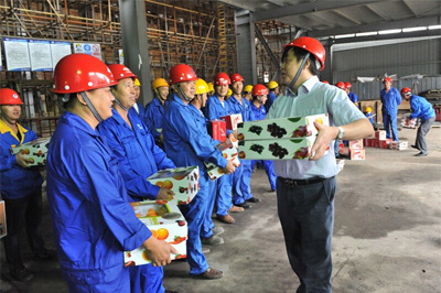 9月30日上午,正值祖國65歲華誕即將來臨之際,受中國五冶集團暨上海有限公司董事長、黨委書記程并強委托,上海有限公司領導徐永鋒、薛志群、汪忠旭、倪治壽及有限公司機關部門負責人一行來到寶鋼一期焦爐原地大修改造工程項目部,慰問奮戰在施工一線的廣大員工們,向他們送去節日慰問品,并祝愿他們節日愉快。
