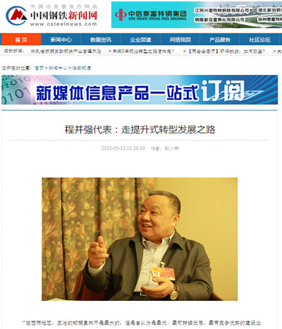 3月12日,中國冶金報1版和中國鋼鐵新聞網(wǎng)同時刊載了兩會特派記者對全國人大代表,中國五冶集團董事長、黨委書記程并強的專訪。