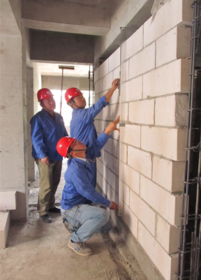 機(jī)械化公司昆鐵家園的管理人員正在進(jìn)行內(nèi)墻砌筑質(zhì)量檢測