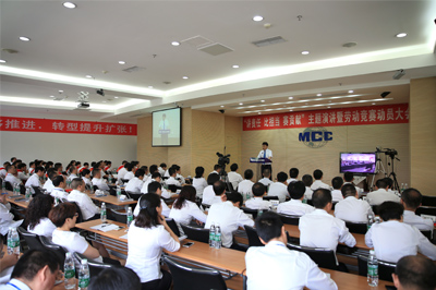 “認(rèn)真踐行‘打造競(jìng)爭(zhēng)優(yōu)勢(shì)’的發(fā)展文化、‘嚴(yán)細(xì)新實(shí)’的管理文化、‘敢擔(dān)當(dāng)看療效’的責(zé)任文化,充滿勇氣、充滿信心、充滿激情,奮力開拓市場(chǎng)、全面提升產(chǎn)品、促進(jìn)經(jīng)營(yíng)創(chuàng)效,為實(shí)現(xiàn)‘轉(zhuǎn)型、提升、擴(kuò)張’戰(zhàn)略目標(biāo)而努力奮斗!”5月4日上午,中國(guó)五冶大廈三樓多功能廳和上海科技樓六樓大廳里掌聲雷動(dòng),一場(chǎng)以“講責(zé)任?比擔(dān)當(dāng)?賽貢獻(xiàn)”的主題演講和“比貢獻(xiàn)?看療效?保目標(biāo)”的勞動(dòng)競(jìng)賽動(dòng)員大會(huì)正在進(jìn)行。集團(tuán)公司領(lǐng)導(dǎo)、董事會(huì)秘書、總經(jīng)理助理、副三總師,集團(tuán)公司機(jī)關(guān)部門正副職、主管,四川地區(qū)各二級(jí)單位班子成員,上海有限公司班子成員,上海有限公司機(jī)關(guān)部門正副職、主管,上海有限公司各單位班子成員共三百余名參加。會(huì)議由集團(tuán)公司董事、總經(jīng)理蒙昌嘉主持。