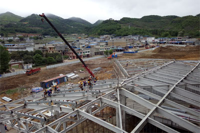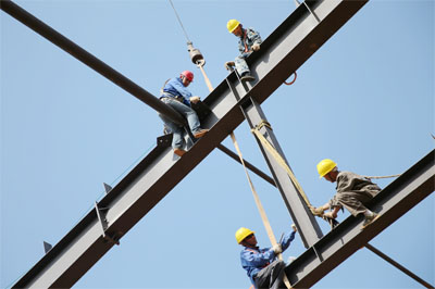平塘星辰主題酒店鋼結構裙樓,工人正在鋼梁上焊接檁托板