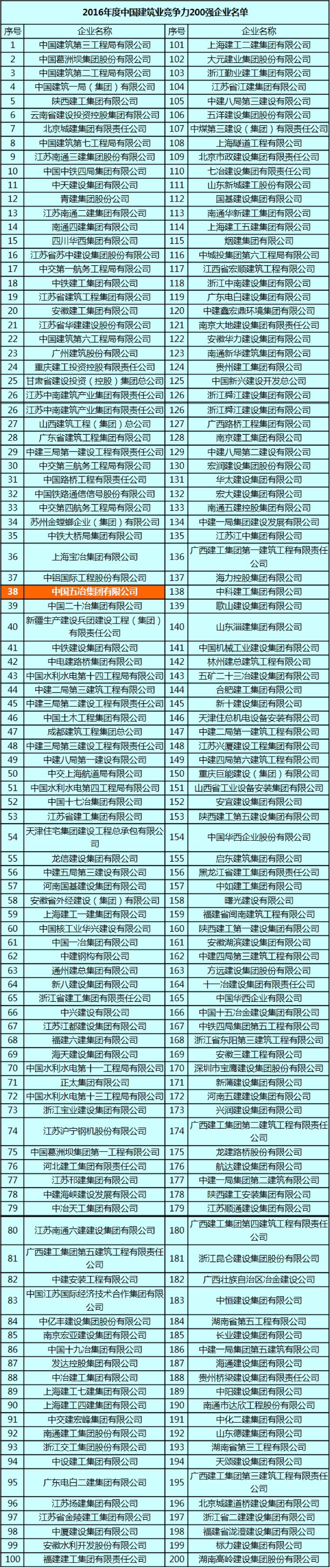 8月23日,中國建筑業協會公布了2016年度中國建筑雙200強企業評價結果。中國五冶集團再次入圍中國建筑業雙200強企業名單,位列競爭力200強企業名單第38位,比上年前進11位。