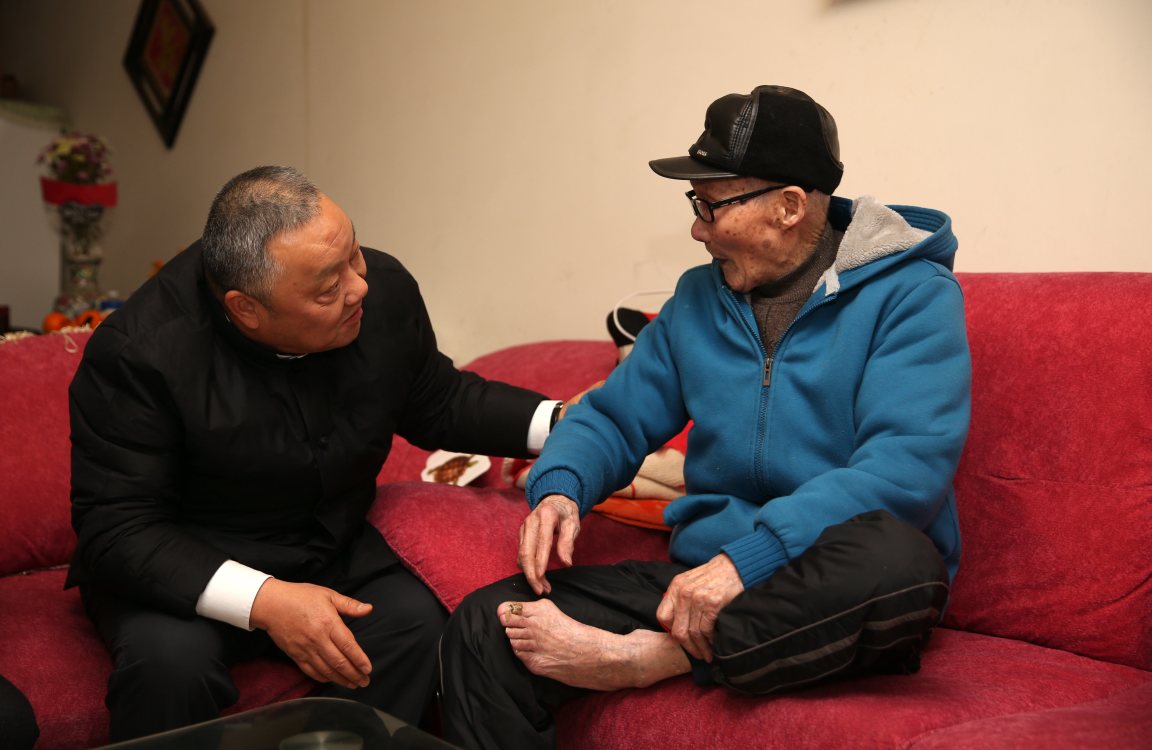 程并強看望退休的百歲老工人曹金和并關心詢問他因公受傷的腳趾