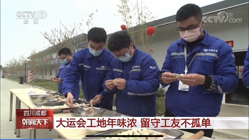 2月14日,大年初三,央視綜合頻道《朝聞天下》欄目以《就地過個暖心年 這群城市建設者堅守崗位不孤單》為題,報道了中國五冶大運會東安湖生態公園項目在大年三十組織留守員工齊聚食堂籌備餃子宴,在歡笑與佳肴中幸福團年的場景。報道指出,東安湖項目部在備足年飯、年貨之余,還為大家發放疫情補貼,送上“過節禮包”,并現場組織大家開展掛燈籠、寫對聯等豐富多彩的活動,讓留守成都大運會建設一線的兄弟姐妹們度過一個溫馨、祥和的春節。