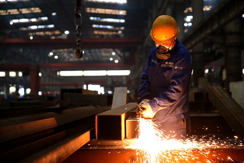 中國五冶鋼結構生產基地內 技術人員在焊花飛舞中加工部件
