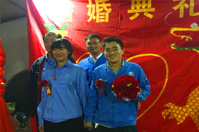 5月28日,青島即墨項目部建筑一線的陳曉東與妻子李海燕因工期緊、任務(wù)重,沒有時間回老家舉辦婚禮,同事們在工地為他們舉辦了這場特別婚禮,項目部還為新人布置了婚房,雖然是工地上的活動板房,但婚房在大紅喜字、彩帶的裝扮下,顯得非常溫馨喜慶。